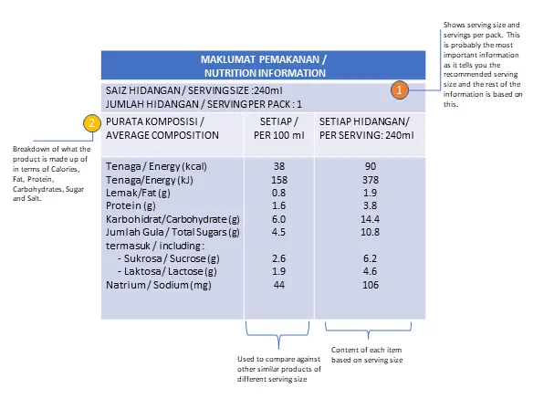 Some labels also contain additional information like vitamins and mineral content. However, it must be pointed out that the Malaysian food regulations state that vitamin and mineral content can only be declared if there is a significant content of vitamins and minerals in the product. This is to protect consumers from misleading information.
