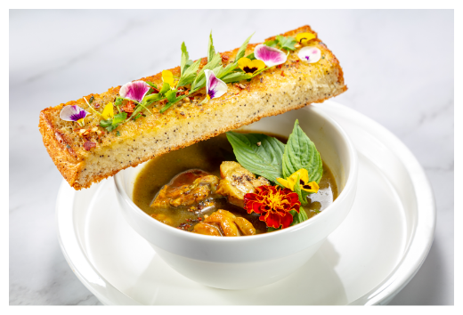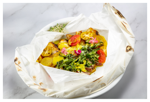 Chicken with vegetables steamed in a parchment paper envelope, served with tomato soup made with three different types of tomatoes with herbs and a smoked garlic croissant for dipping